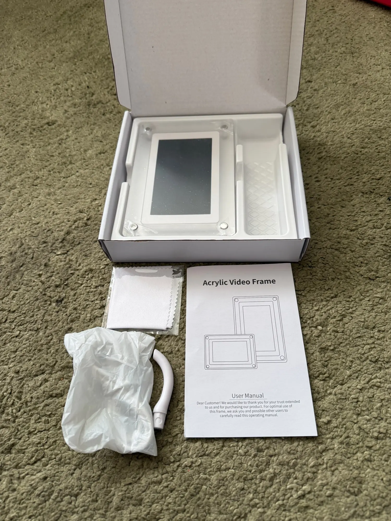Acrylic photo frame * 1, bracket * 1, instruction manual * 1, dustproof rag * 1, Power Adapter * 1,100CM USB data cable